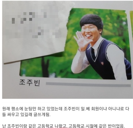 한 온라인 커뮤니티에서 조주빈의 고등학교 졸업사진을 올리며 본인이 그의 고등학교 동창이라고 인증한 사람이 등장했다.