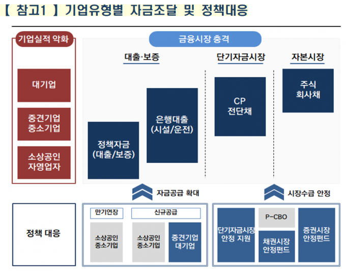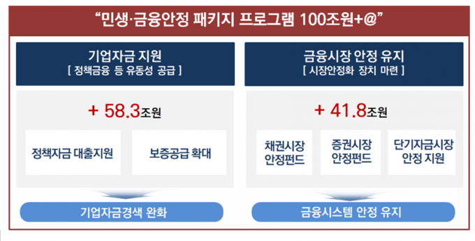 이날 발표된 민생·금융안정 패키지 프로그램 100조 원+α 공급 방안은 크게 세 가지로 나뉜다. △ 정책금융기관의 선제적 기업자금 공급 △ 회사채·단기자금시장 안정화 지원 △ 주식시장 수요기반 확충 등이다.
