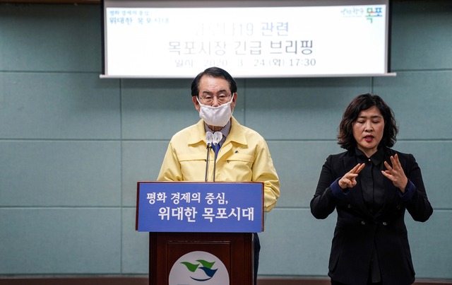 ▲ 김종식 전남 목포시장이 24일 오후 시청 상황실에서 '코로나19' 확진자 발생과 관련, 긴급 브리핑을 하고 있다. [목포시 제공]