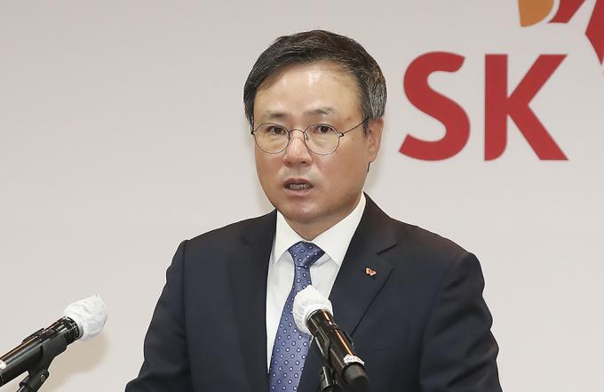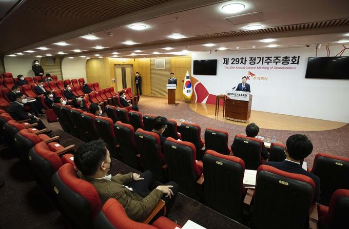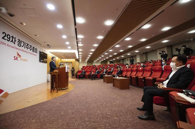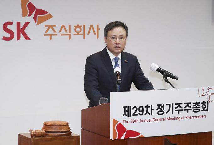 25일 오전 서울 종로구 서린동 SK본사에서 열린 제29차 정기주주총회에서 SK 장동현 대표이사 사장이 발언하고 있다.