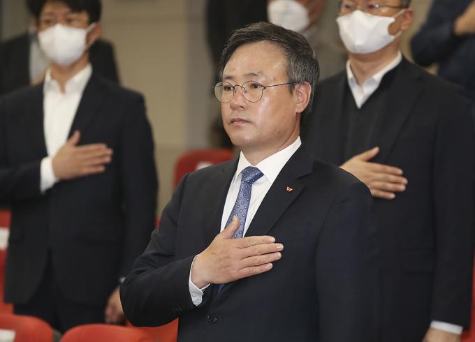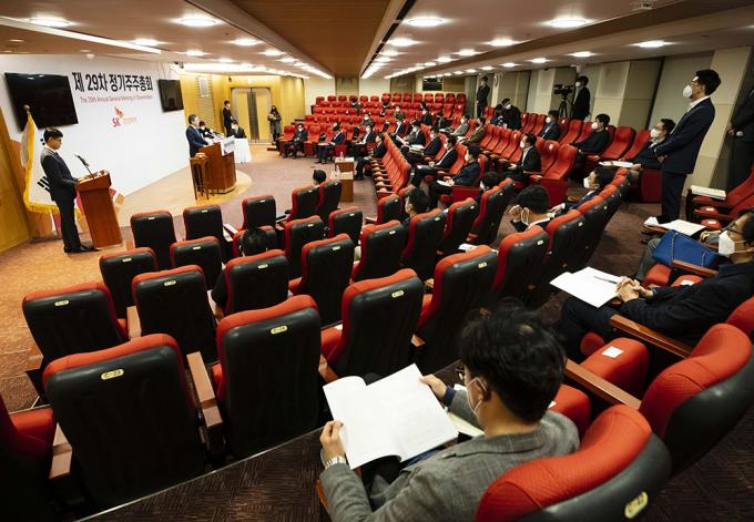 25일 오전 서울 종로구 서린동 SK본사에서 열린 제29차 정기주주총회에서 SK 장동현 대표이사 사장 등 참석자들이 국민의례를 하고 있다.