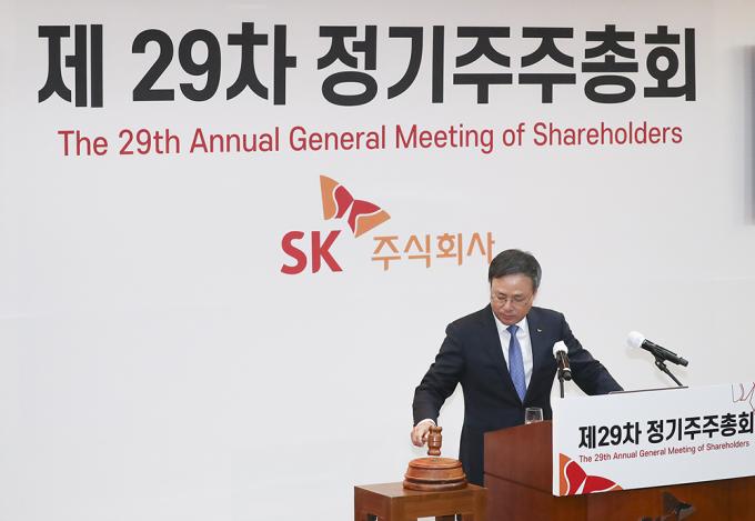 25일 오전 서울 종로구 서린동 SK본사에서 열린 제29차 정기주주총회에서 SK 장동현 대표이사 사장이 의사봉을 두드리고 있다.