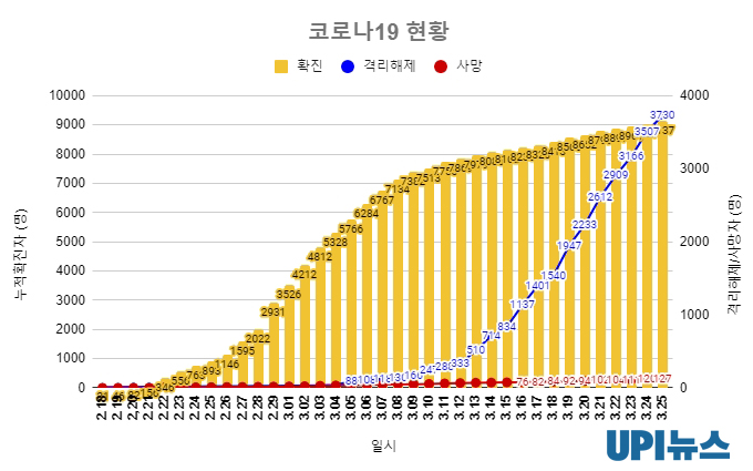 완치판정을 받고 격리 해제된 사람도 223명 늘어 총 3730명으로 집계됐다.