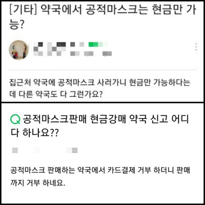 최근 공적마스크를 사러 약국에 갔다 '현금 결제 요구'에 당황하는 사례가 늘고 있다. 웹사이트, 카페 등에는 "약국 마스크 현금 결제만 가능하다는데 다 그런가요?", "공적마스크 현금 강매 약국 신고는 어디에 하나요?" 등의 이야기가 올라온다.