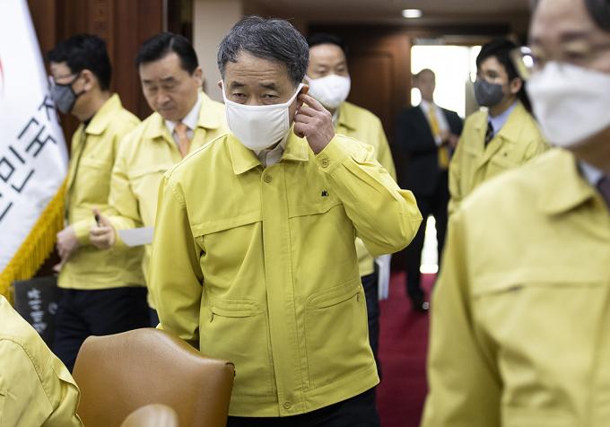 ▲ 보건복지부가 저소득층 한시생활지원, 아동양육 한시 지원사업 등 소비 상품권 지원 사업을 4월 중 시작할 예정이라고 25일 밝혔다. 사진은 박능후 보건복지부 장관이 지난 20일 오전 서울 종로구 정부서울청사에서 열린 코로나19 대응 중앙재난안전대책본부 회의에 참석하고 있는 모습. [정병혁 기자]