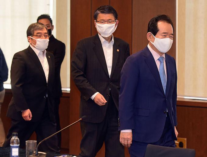 정세균 국무총리와 은성수 금융위원장, 윤석헌 금감원장이 25일 서울 중구 은행회관에서 열린 코로나19 위기극복을 위한 금융지원 간담회 및 협약식에 참석하고 있다.