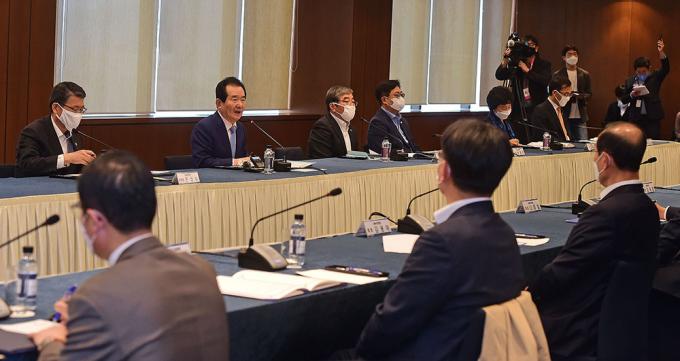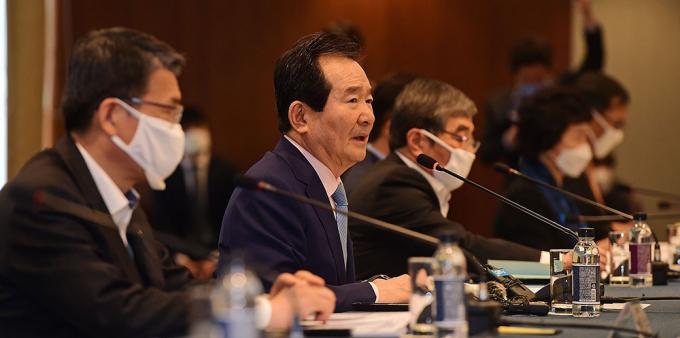 정세균 국무총리가 25일 서울 중구 은행회관에서 열린 코로나19 위기극복을 위한 금융지원 간담회 및 협약식에서 모두발언을 하고 있다.