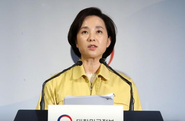 ▲유은혜 사회부총리 겸 교육부 장관이 지난 17일 오후 서울 종로구 정부서울청사 브리핑룸에서 유치원과 초·중·고등학교의 3차 개학 연기 및 후속 대책 등을 발표를 하고 있다. [뉴시스]