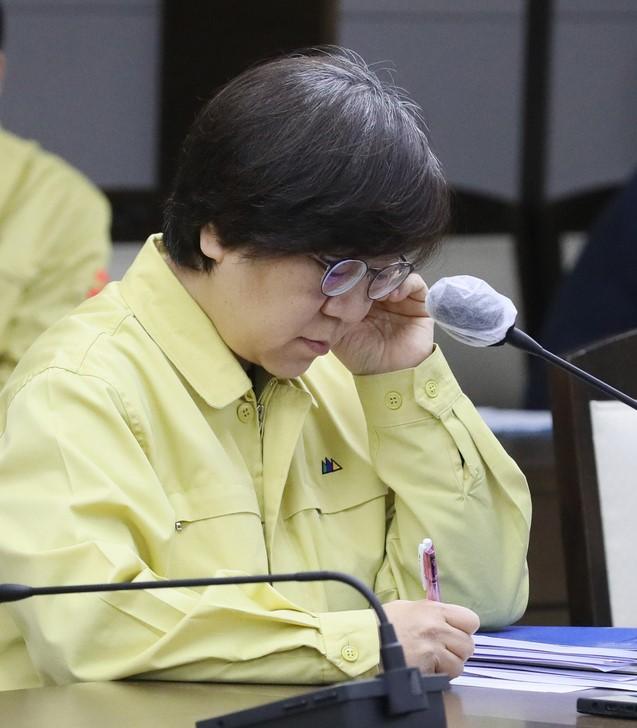 ▲정은경 질병관리본부장이 지난 24일 오전 정부세종청사에서 열린 중앙재난안전대책본부 회의에 참석, 회의자료를 살펴보고 있다. [뉴시스]