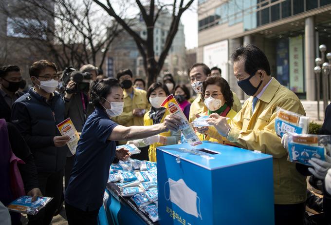▲ 서울시는 보건용 마스크 수급 불균형이 지속됨에 따라 봉제업체를 통해 필터 삽입이 가능한 마스크 60만 개와 교체형 필터 300만 개를 제작해 공적마스크 소외계층에 지원한다고 25일 밝혔다. 사진은 정세균 국무총리와 박원순 서울시장이 25일 오전 서울 종로구 동화면세점 앞에서 열린 착한마스크 캠페인 현장을 찾아 보건용 마스크를 기부하는 시민들에게 면 마스크를 전달하고 있는 모습. [정병혁 기자]