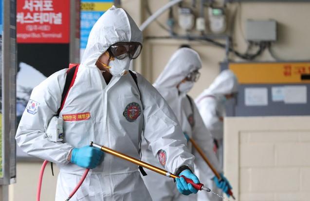 ▲'코로나19'가 확산 중이던 지난 13일 제주시시외버스터미널에서 해병대 9여단 장병들이 방역을 하고 있다. [뉴시스]
