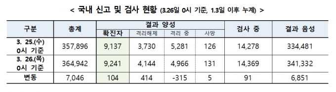 중앙방역대책본부는 26일 0시 기준 코로나19 확진자가 전날 0시보다 104명 증가했다고 밝혔다. 하루 신규 확진자 수는 전날 100명에 이어 세자릿수를 유지했다.