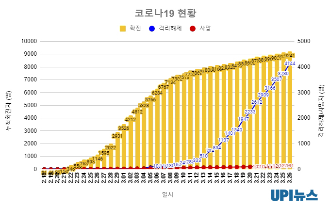 격리 해제 환자 414명 늘어 총 4144명…완치율은 44.8% 국내 '코로나19' 확진자가 하루 동안 104명 늘어 9241명으로 집계됐다. 이 가운데 검역 과정에서 30명의 확진자가 나왔다.