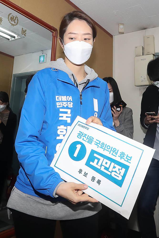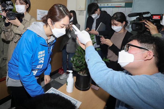 제21대 총선에서 서울 광진을에 출마하는 더불어민주당 고민정 후보가 26일 오전 서울 광진구선거관리위원회에서 후보 등록 전 체온 측정을 하고 있다.
