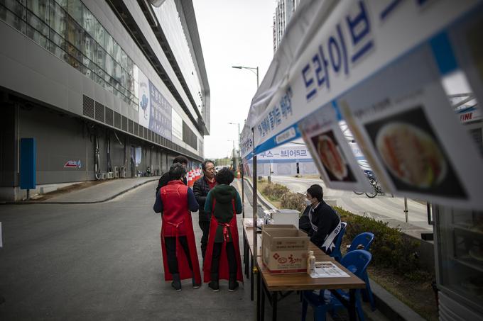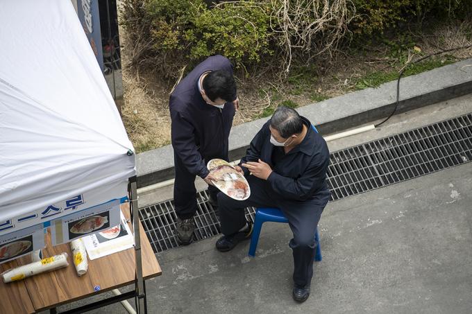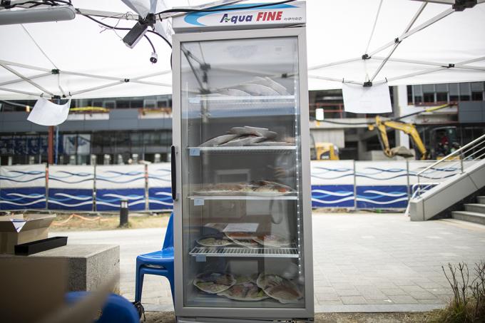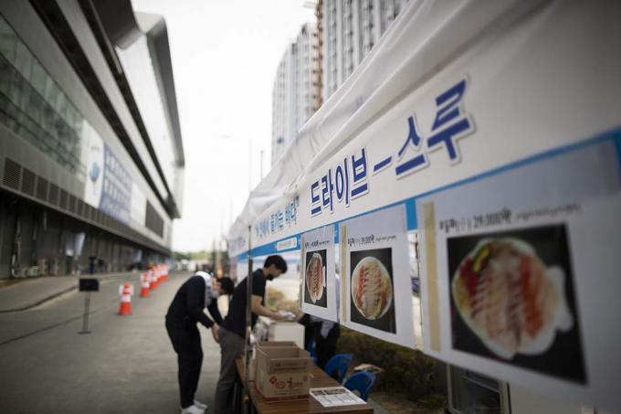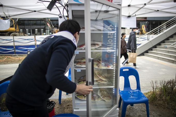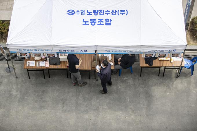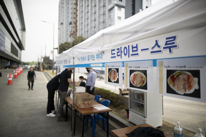 26일 오후 서울 동작구 노량진수산시장에서 수산물 드라이브 스루 판매소가 운영되고 있다. 수협중앙회는 코로나19로 위축된 수산물 소비 활성화를 위해 오늘부터 차에 탑승한 채 수산물을 구입할 수 있는 드라이브 스루 판매 방식을 도입했다.