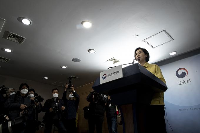 ▲ 유은혜 사회부총리 겸 교육부 장관이 지난 17일 오후 서울 종로구 정부서울청사에 코로나19 확산 방지를 위한 2020학년도 신학기 개학 연기 및 대응계획을 발표하고 있다. [정병혁 기자]