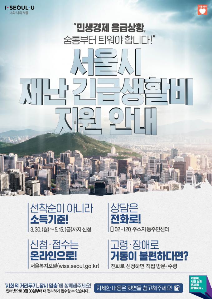 서울시가 코로나19로 타격을 입은 시민들의 생활안정을 지원하기 위한 '재난긴급생활비' 신청접수를 30일부터 시작한다.