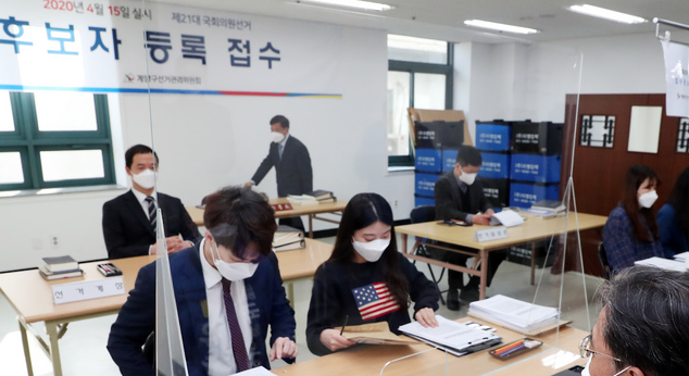 ▲ 제21대 국회의원선거 후보자 접수 첫날인 26일 오전 인천시 계양구 선거관리위원회에서 코로나19 예방을 위해 투명 칸막이를 설치하고 후보 접수를 받는 모습. [뉴시스]