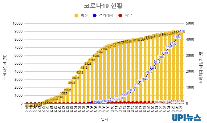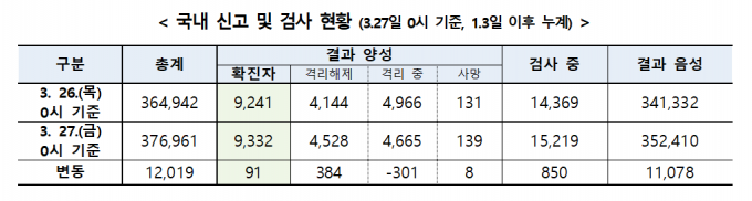중앙방역대책본부는 27일 0시 기준 코로나19 확진자가 전날 0시보다 91명 증가해 총 9332명이라고 밝혔다.