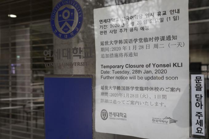 ▲ 연세대학교가 코로나19 확산 방지를 위해 올 4월 중순까지 모든 강의를 온라인 수업으로 진행한데 이어 올해 1학기 중간고사를 중단하기로 했다. 사진은 코로나19 확산 공포가 전 세계적으로 확산되고 있는 지난 1월 28일 오전 서울 서대문구 연세대학교에 한국어학당 임시 휴교 안내문이 붙어있는 모습. [문재원 기자]