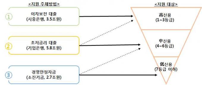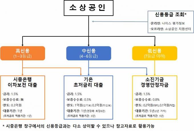 정부는 "신용등급을 미리 확인하고, 본인 신용등급에 따라 1등급에서 3등급 분들은 시중은행, 1등급에서 6등급 분들은 기업은행, 4등급 이하 분들은 소진공에 각각 대출을 신청한다면 보다 빨리 대출을 받을 수 있을 것"이라고 설명했다.