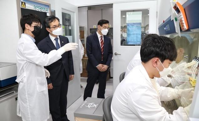 ▲박원주 특허청장이 지난 12일 '코로나19' 치료제 개발기업인 서울 금천구 가산동 유틸렉스를 방문해 시설을 둘러보고 있다. [특허청 제공]