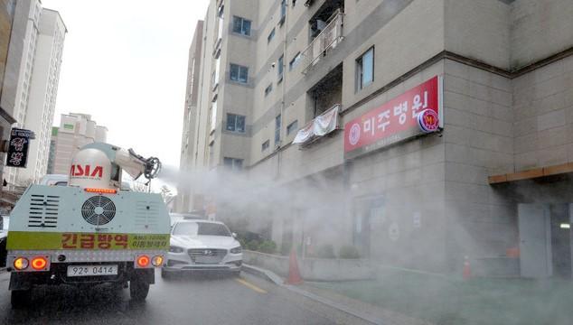 ▲ 27일 오후 대구 달성군 관계자들이 60여 명의 '코로나19' 확진자가 발생한 달성군 다사읍 제이미주병원 주변을 방역하고 있다. [뉴시스]
