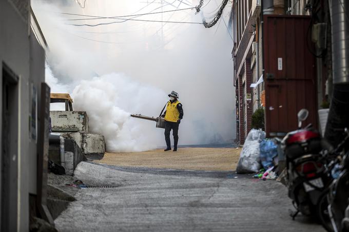 ▲ 종로구 방역단이 18일 오전 서울 종로구 창신동 일대에서 코로나19 확산 방지를 위한 방역 작업을 하고 있다. [정병혁 기자]