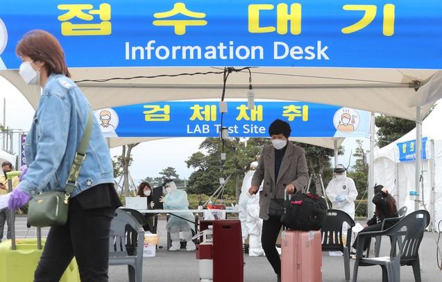 ▲'코로나19'가 확산 중인 30일 제주국제공항 내에 마련된 개방형 선별진료소(오픈 워킹 스루·Open Walking Thru)에서 국외 입국자를 대상으로 코로나19 검사가 진행되고 있다. [뉴시스]