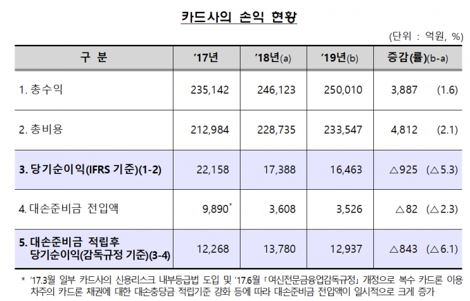 감독규정 기준을 적용하면 카드사의 당기순이익은 1조2937억 원으로, 전년(1조3780억 원) 대비 6.1%(843억 원) 줄었다. 감독규정 기준은 IFRS 기준에서 대손준비금 전입액을 반영한 것이다.