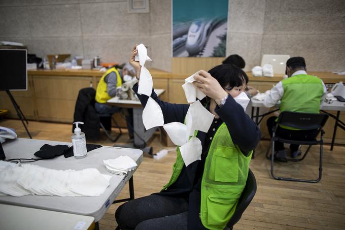 ▲ 지난 3월 18일 오전 서울 노원구청 대강당에서 코로나19 극복 노원 면마스크의병단이 친환경 수제 면마스크를 제작하고 있다. [정병혁 기자]