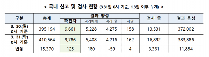 중앙방역대책본부는 31일 0시 기준으로 코로나19 확진자가 전날 0시보다 125명 증가했다고 밝혔다.