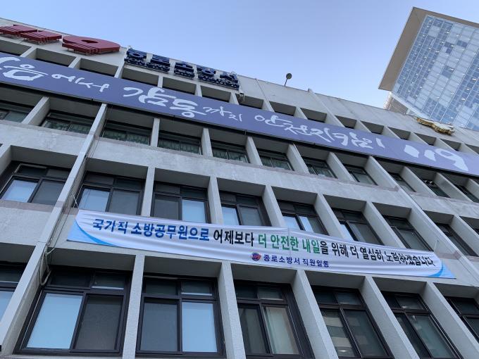 ▲ 31일 서울 종로구 종로소방서에 소방공무원 국가직 전환 관련 현수막이 걸려 있다. [권라영 기자]2019.12.31.