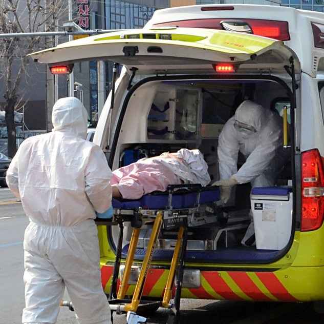 ▲ 방호복을 착용한 119 구급대원들이 '코로나19' 환자를 병원으로 이송하는 모습. [뉴시스]