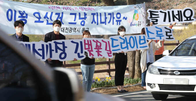 대전 동구청은 지난달 31일 페이스북에 "사회적 거리두기가 중요한 요즘, 관광도 드라이브스루가 대세여유~"라며 "꽃은 멀리서 봐도 예쁘니까요, 이왕 오신 거 차에서만 보시고 올해는 그냥 지나가유~"라는 내용의 글을 올렸다.