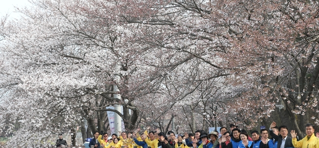 ▲ 지난해 4월 7일 제1회 대청호 벚꽃축제가 열리고 있는 대전 동구 신하동일원에서 황인호 구청장을 비롯한 시민들이 벚꽃길을 거닐고 있다. [동구청 제공]