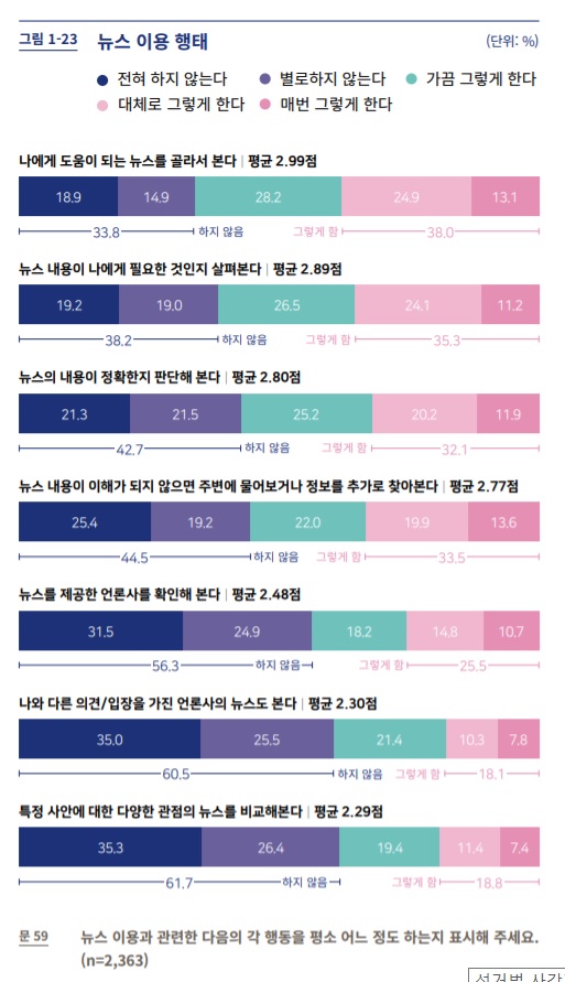 "청소년들이 뉴스를 선별적으로, 비판적으로, 균형적으로 읽는지를 묻는 일곱 개의 문항에서, 5점 기준으로 모두 3점 이하 값을 보였다. 분별력 있는 뉴스 이용자라고 말하기는 어렵다."(한국언론진흥재단, '2019 10대 청소년 미디어 이용 조사')