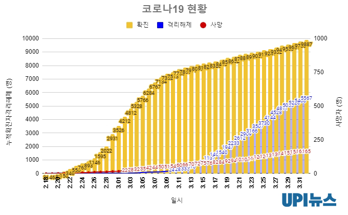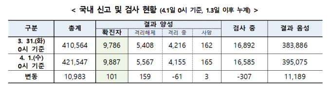 중앙방역대책본부는 1일 0시 기준 코로나19 확진자가 전날 0시보다 101명 증가해 누적 9887명이라고 밝혔다.
