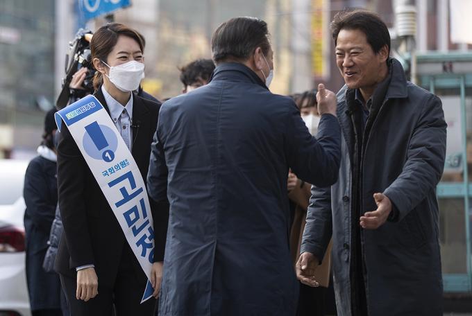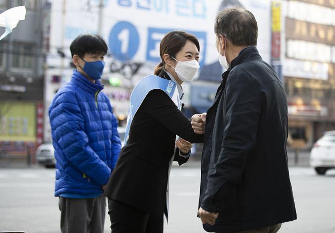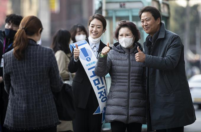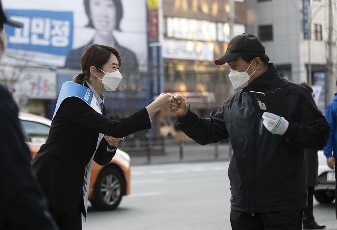더불어민주당 광진을 고민정 후보가 4·15 제21대 국회의원선거 공식 선거운동 첫날인 2일 오전 서울 광진구 자양사거리에서 시민들과 인사를 나누고 있다.