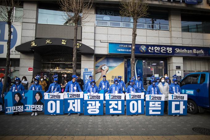 4·15 제21대 국회의원선거 공식 선거운동 첫날인 2일 오전 서울 광진구 자양사거리에서 더불어민주당 광진을 고민정 후보 선거 운동원들이 마스크를 쓴 채 선거운동을 하고 있다.