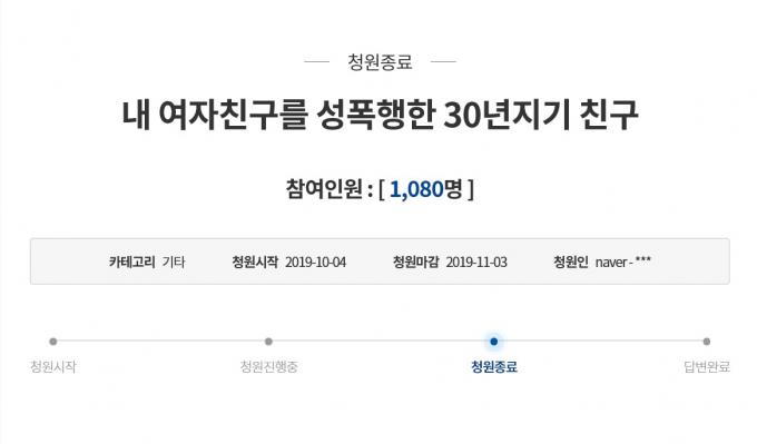 ▲ 여자친구를 성폭행한 뒤 진정한 사과를 하지 않는다는 이유로 30년 지기 친구를 살해한 30대 남성이 재판을 받게 됐다. 해당 남성이 청와대 국민청원에 올린 청원. [청와대국민청원 캡처]