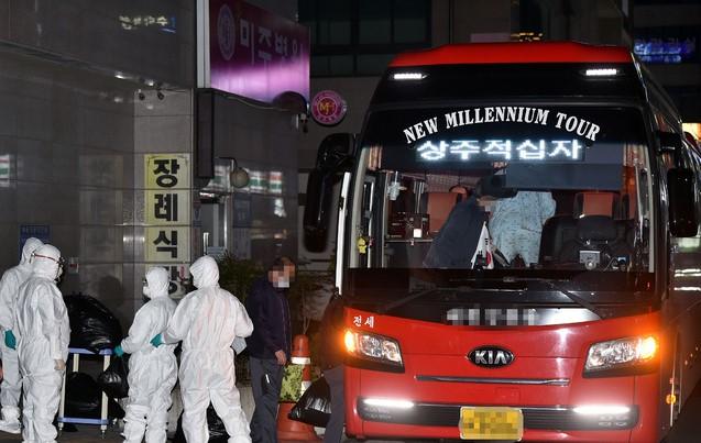 ▲ 지난달 30일 오후 코로나19 신규 확진자 50여 명이 추가로 발생한 대구 달성군 다사읍 제2미주병원에서 상주적십자병원으로 이송되는 환자들이 버스에 탑승하고 있다. [뉴시스]