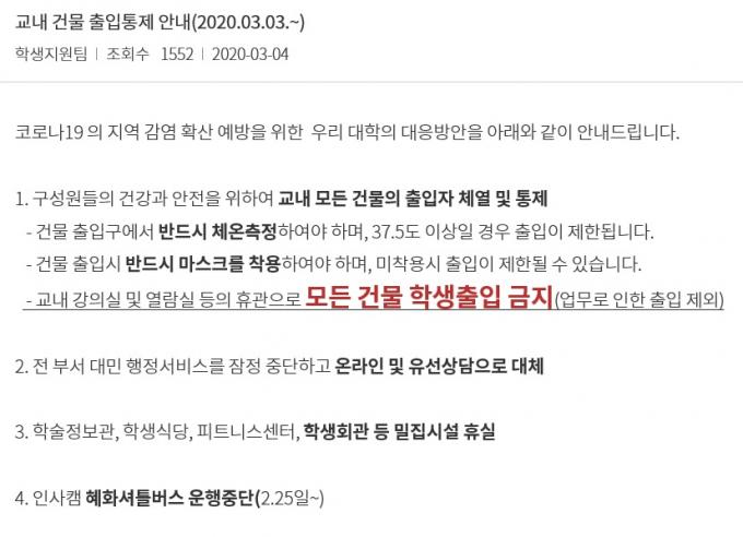 이 밖에도 셔틀버스 운행 중단, 교내 공간 대관 중단, 개방 PC실습실 운영 중단 및 IT서비스센터 한시적 축소 운영, 교내 식당 운영시간 변경 등을 안내했다.