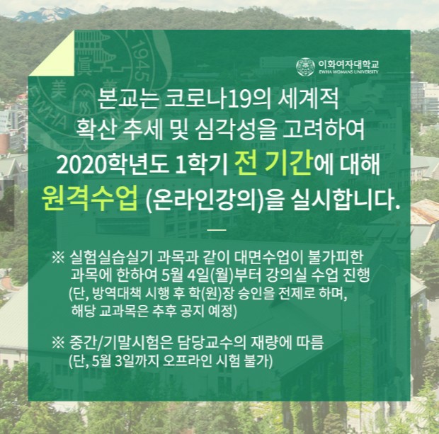 이화여대는 지난 1일 이번 1학기 전 기간 온라인 강의안을 발표했다. 앞서 지난달 19일 울산과학기술원(UNIST)은 대학 중 처음으로 1학기 내내 온라인 강의를 하기로 결정한 바 있다.