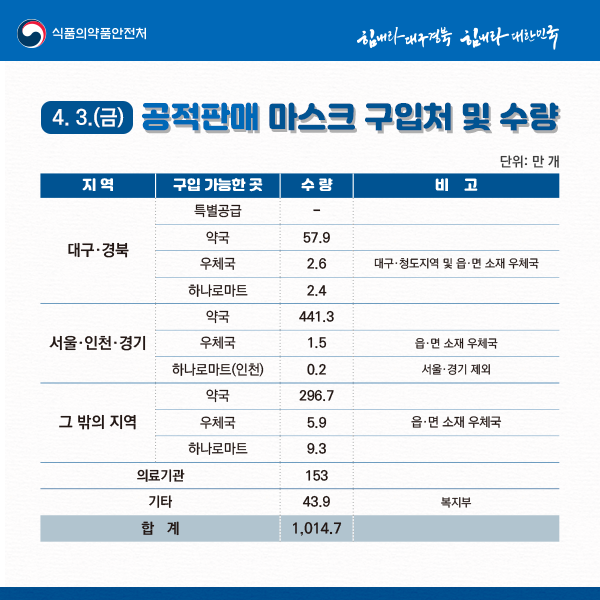 전국 약국에 795만9000장을 공급했다. 서울·경기를 제외한 농협하나로마트와 대구·청도 및 읍·면 소재 우체국에도 각각 11만9000장, 10만 장이 공급됐다.