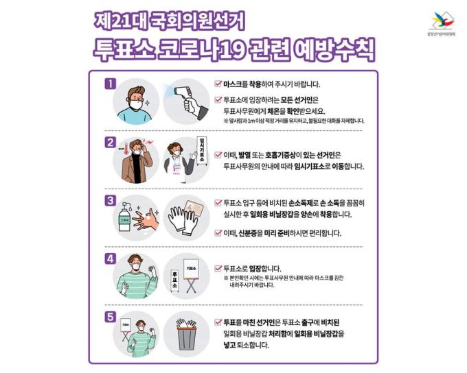 김우주 고려대병원 감염내과 교수는 "투표소에 오는 시민들은 마스크를 쓰고 손소독을 꼭 해야 한다"면서 "투표소가 밀폐된 공간이기에 창문을 열어 환기를 자주 시키는 것도 필요하다"고 말했다.