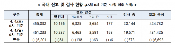 중앙방역대책본부는 5일 0시 기준 코로나19 확진자가 전날 0시보다 81명 증가했다고 밝혔다.