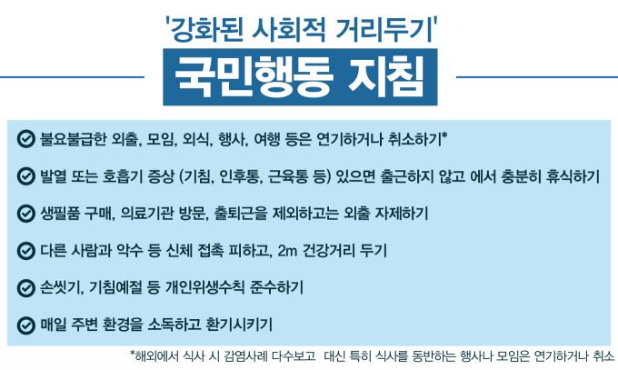 먼저 개인 행동수칙은 크게 3가지다. △ 모임과 외출자제, 사람간 접촉 최소화 △ 닫힌 공간에서 많은 사람들이 모이는 장소나 종교행사 자제 △ 감기 증상시 3~4일 경과 관찰 후 콜센터 문의나 선별진료소 방문 등이다.