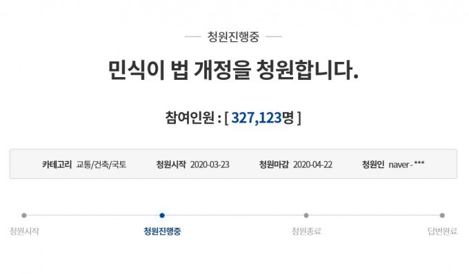 지난달 23일 청와대 국민청원 홈페이지에 올라온 '민식이법 개정을 청원합니다'라는 제목의 청원이 6일 32만 7000여명의 동의를 받았다.
