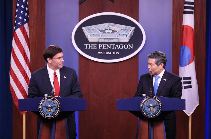 마크 에스퍼 미국 국방장관과 정경두 국방장관은 전화통화를 통해 공정한 방위비 분담을 논의했다.
